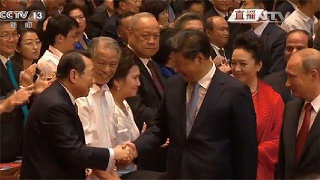 《勝利與和平》文藝晚會現(xiàn)場,習近平主席和謝國民董事長親切握手