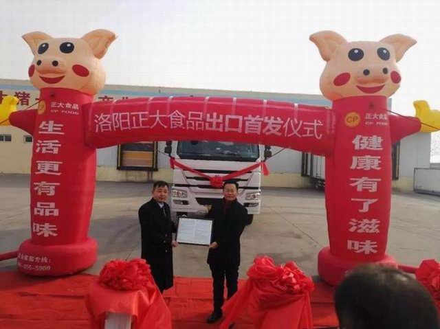 洛陽(yáng)正大食品出口香港的首車(chē)肉制品,