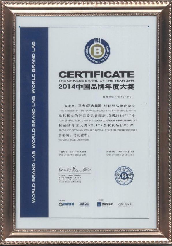 2014年12月29日,“總裁世界年會”在北京東方君悅大酒店舉行。本次大會揭曉了享有“中國品牌奧斯卡”之稱的 “世界品牌實驗室2014年中國品牌年度大獎”評選結(jié)果,正大集團、中國國航、國家電網(wǎng)、騰訊控股、中國人壽、中國國旅、北汽集團、華為技術(shù)、長虹電器等30個活躍在中國經(jīng)濟舞臺的領(lǐng)軍品牌榮獲 “中國品牌年度大獎”,正大集團以在農(nóng)牧食品業(yè)多年的探索實踐和管理經(jīng)驗,以及良好的產(chǎn)品品質(zhì)和品牌知名度,榮獲農(nóng)牧食品行業(yè)“中國品牌年度大獎***”榮譽稱號。哈佛商學(xué)院教授約翰?戴騰博士(John Deighton)、耶魯大學(xué)管理學(xué)院教授萊維·多爾博士(Ravi Dhar)分別進(jìn)行頒獎及致詞。